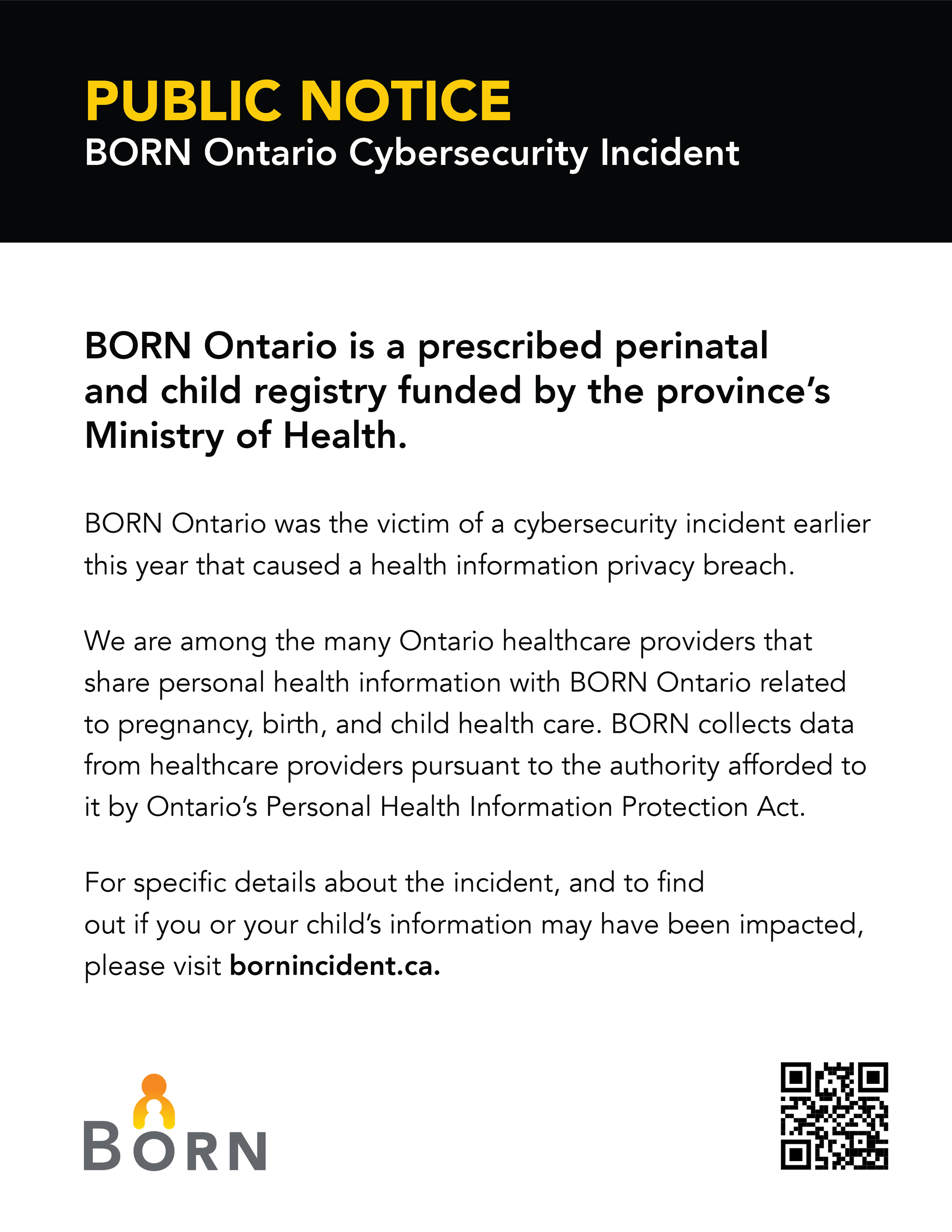 The cybersecurity incident affected BORN Ontario’s records and systems. Our organization’s systems were not affected by the cybersecurity breach.